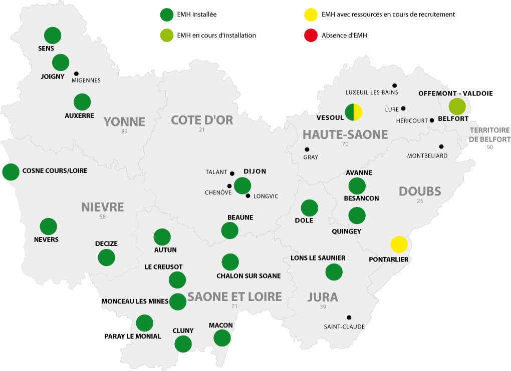 Ainsi, en région Bourgogne-Franche-Comté (BFC), le dispositif des équipes mobiles d'hygiène (EMH), mis en place suite à la publication de la circulaire interministérielle DGCS/DGS n°2011-377 du 30 septembre 2011 relative à la mise en œuvre du programme national de prévention des infections dans le secteur médico-social 2011-2013, a une antériorité de plus de dix ans maintenant.